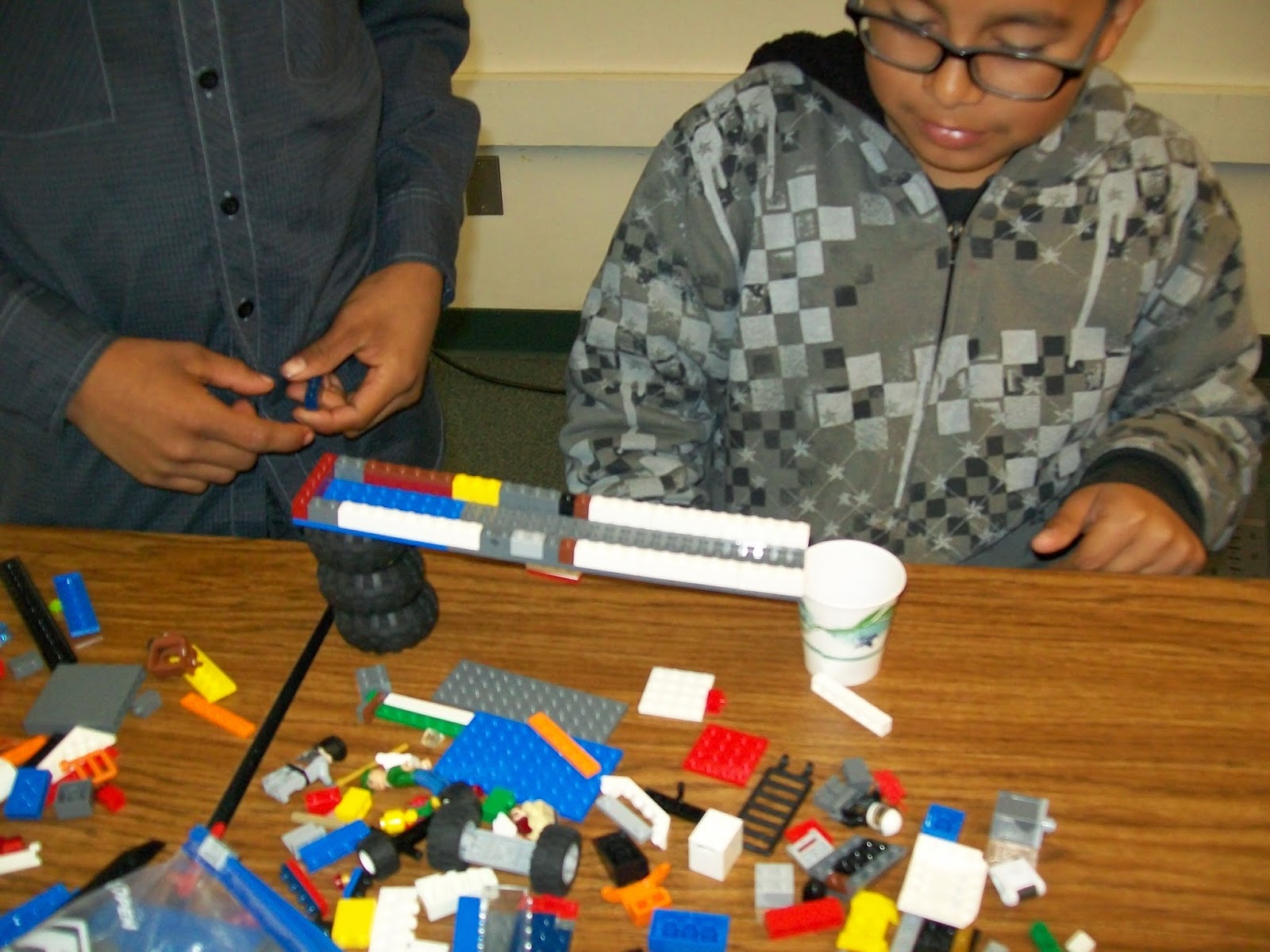 The challenge for today was to build a Lego Contraption at least one foot long that can guide a marble from top to bottom and land in a small cup. This is a similar challenge as a few weeks ago, but we used paper instead of Legos. They were able to use similar principles from the last build and apply them to today's challenge. Students were able to have a partner or work alone.